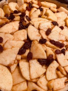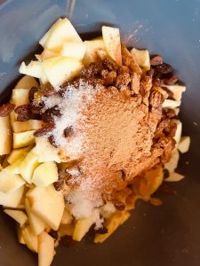 Voeg de appelplakjes samen met de rozijnen, suiker en kaneel samen. Roer het geheel goed door.