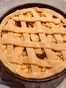 Het laatste stuk deeg uitrollen en verdelen in stroken van ca. 1 cm breed. Maak hiermee een mooi raster op de bovenzijde. Nog een beetje deeg over? Maak nog iets smallere strookjes en bekleed de rand voor een mooie afwerking.