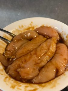 Olie in een hapjespan en daarin de kip bakken. Op het eind honing toevoegen. Nog 2 minuten mee laten bakken. Dan alles uit de pan en in een schaal. Afdekken met aluminiumfolie.