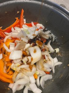 In dezelfde hapjespan wat olie toevoegen en paprikarepen en witte deel van paksoi toevoegen. Sojasaus en oestersaus erbij, even aanbakken. Voeg 2 dl water toe en laat ca. 10 minuten zachtjes stoven (deksel op de pan).