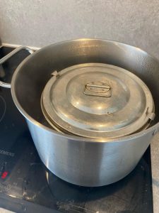 1. Giet het poffertmengsel in de poffertvorm. Sluit het deksel en plaats de vorm in de pan. Laat dit zachtjes koken, na 3 uur is de poffert gaar.
